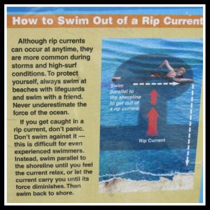 Here is some advice they give you if you get caught in a rip current: Don’t panic. Don’t swim against it. Instead swim parallel to the shoreline until you feel the current relax, or let the current carry you until its force diminishes. Then swim back to shore. Always swim at a beach with lifeguards and with a friend. Never underestimate the force of the ocean.
