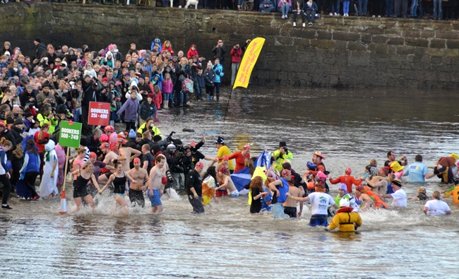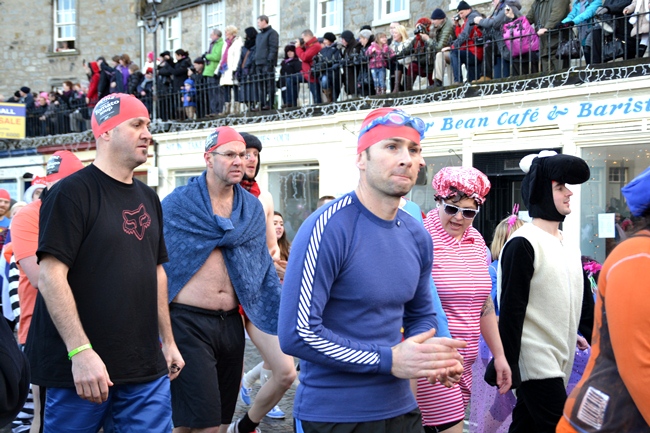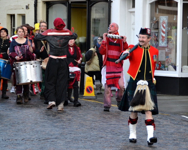 On New Year`s Day, Hogmanay ends its celebrations with a whole day of events. There`s a Dogmanay, a Triathlon, a festival etc. But I decided to go out to South Queensferry for the Loony Dook, an annual mass splash in the River Forth. It all starts with a Parade and the Dookers walking through the town on their way for a New Years plunge.