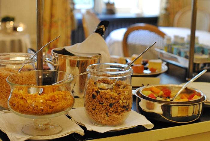 The Champagne breakfast buffet had a nice selection of bread, artisanal jams, smoked salmon, … but also a warm section with eggs, bacon and more. Fresh orange juice, coffee & tea served in beautiful decorated porcelain and of course champagne.