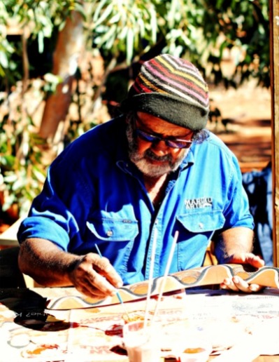 Under a burning sun smoke spirals up from a bonfire while flies buzz all around, but that doesn`t distract indigenous artist, Billy Cooley, from his work.