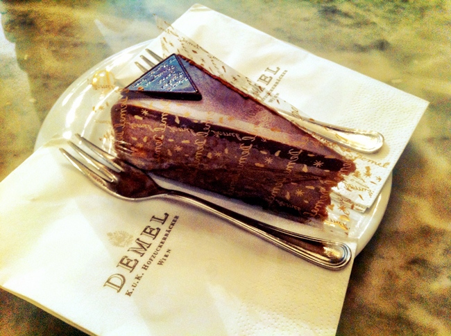 This address (Kohlmarkt 14) is famous because of its pastries and chocolates. The pastries are delicious! Last time I was there, they even had a chocolate fountain! (Opening hours: daily: 10 AM – 7 PM). Try the chocolate torte, as seen above…yummy.