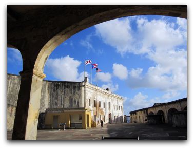 The tree flags you see are the Burgundy Cross, the flag of the Commonwealth of Puerto Rico and the flag of the United States. The Burgundy Cross was the Spanish military flag that flew during most of the Spanish colonial period.