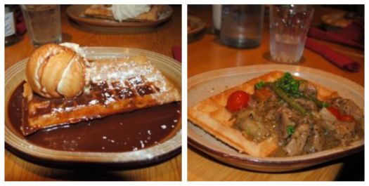 When I got the menu I was astonished by the choices they offered. For me waffles are a sweet treat or dessert, but apparently you can combine waffles with more than just ice cream, sugar, chocolate sauce or fruit. Here they serve all kinds of savory waffles, like a waffle with tomato and cheese or with pesto and lamb…