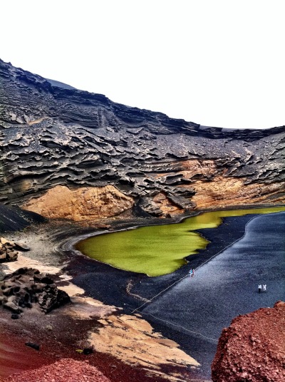 Quite an interesting place I have to say! There`s a green lake in the middle of a very special scenery in my opinion. A black sandy beach against crater walls that show contrasts of yellow and red.
