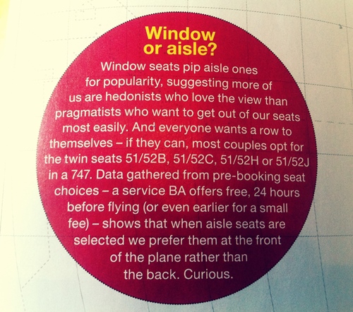 Pretty much the same as you – window for short flights (2 hours or less) and aisle for the others so that you can easily get up and move around. Generally doesn’t bother me whether I’m up the front or at the back and I only choose seats on the long-haul flights, too expensive to justify on the shorter ones.